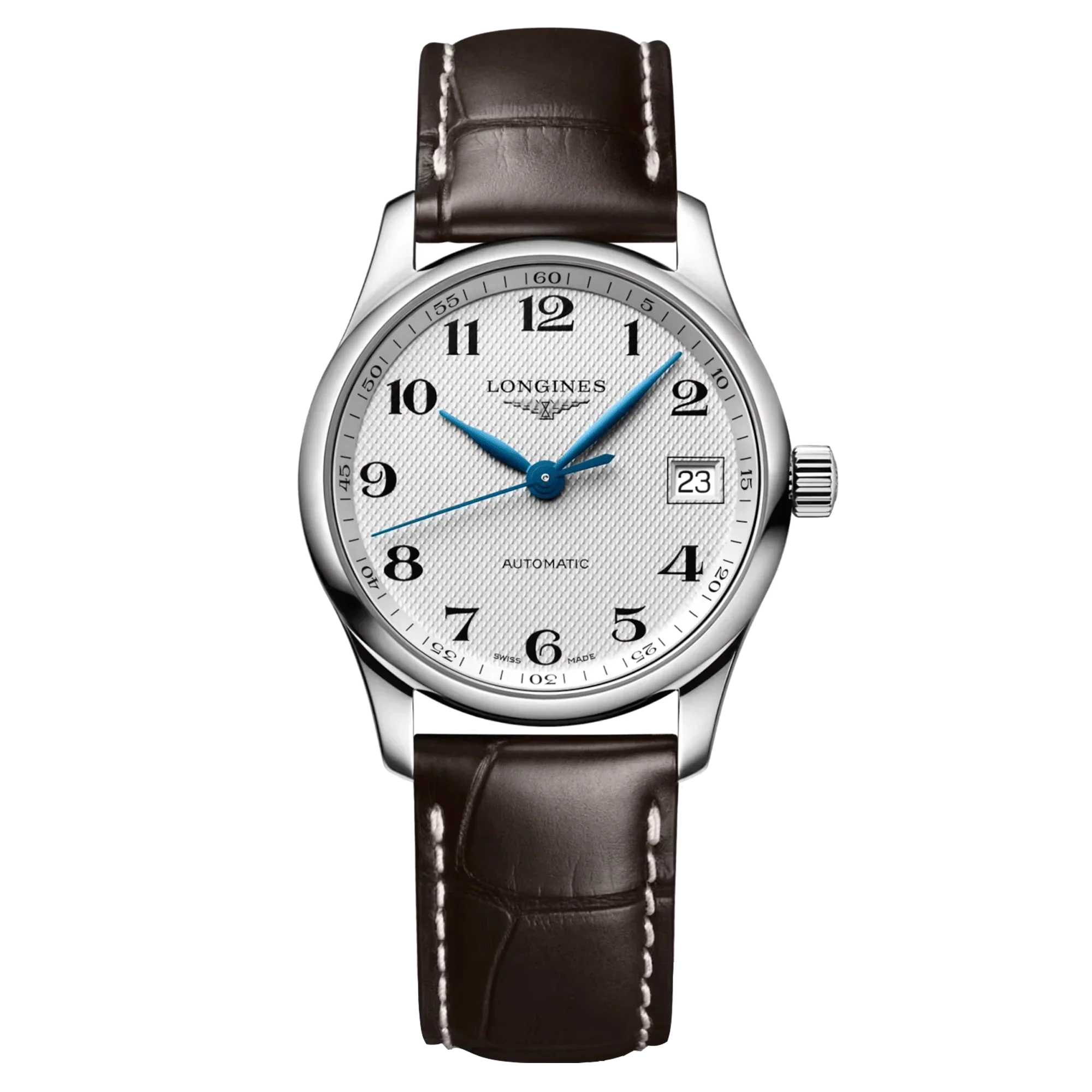 Longines Master Collection Automatikuhr, silbernes Zifferblatt, braunes Lederarmband, 34 mm